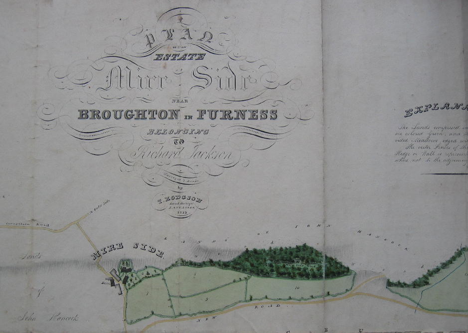 Broughton in Furness PLAN OF AN ESTATE AT MIRR SIDE near Broughton in Furness Belonging to Richard Jackson. Surveyed and Drawn by T. Hodgson Land Surveyor Lancaster, 1822. Manuscript plan in ink and full colour, on paper backed with linen, size 21" x 25". Very decorative large calligraphic title, 'Terrier' with table of fields and measure. Scale 3 chains to an inch. Shows roads, buildings, streams, fields, hedges, woodland. High ground shown with light hachures in wash. The wood to the east of the main house is shown in a very realistic way, painted as in a watercolour. Old split along horizontal fold, with some minor chipping of paper, traces of vertical folds at left hand side in blank area. The map has been backed with linen at a later date. With notes in a later hand as to sale of various fields etc. to 3 named buyers and information on ownership: 'This estate was the property of Sarah Ann the wife of Richard Jackson who was the daughter of The Rev. Robert Biggs.' 1822. £150.00 -- See Illustration