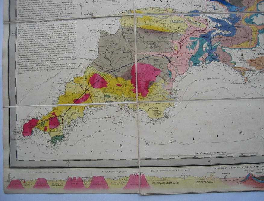 HAND-COLOURED GEOLOGICAL MAP Walker (J & C) A GEOLOGICAL MAP OF ENGLAND AND WALES AND PART OF SCOTLAND Showing also the Inland Navigation by means of Rivers and Canals with their elevation in feet above the Sea, together with the Rail Roads & Principal Roads. Fully hand-coloured, with full explanation of colours, with Mineral Character, Subdivisions, and a section from Land's End to the German Ocean. Size approx. 46" x 38", dissected and mounted on linen, folding into blind-stamped paper-covered slip-case, size 10" x 7", later morocco labels. Some slight foxing in a few areas at edges. Published by J. & C. Walker, No. 9 Castle Street, Holborn, London. September 18th, 1835. £580.00 -- See Illustration
