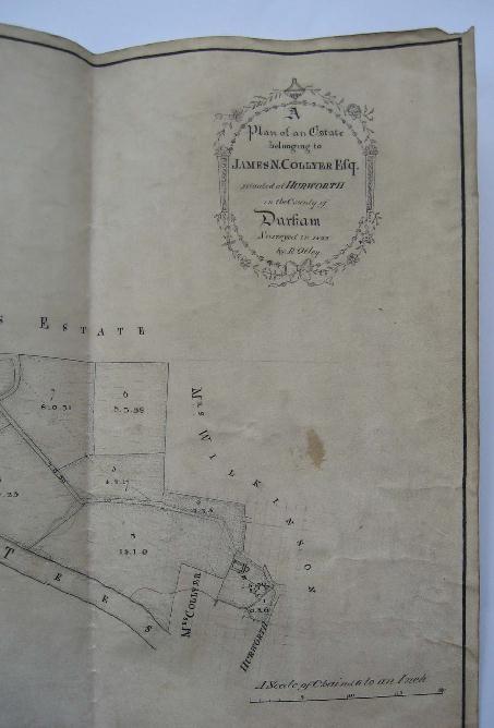 Hurworth A PLAN OF AN ESTATE BELONGING TO JAMES N. COLLYER ESQ. SITUATED AT HURWORTH in the County of Durham Surveyed in 1825 by R. Otley. Hand drawn plan in ink on vellum, size approx. 12«" x 21«", scale 6 chains to an inch, decorative cartouche, table listing the land and acreage, and a second table listing the acreage of the river and bank. The land borders the River Tees. Very slightly dusty. 1825. £110.00 -- See Illustration